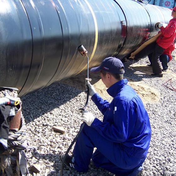 在施工時,將管道預(yù)熱,用機(jī)器或手工纏繞在處理過的管道上,保證搭接寬度不小于25mm,均勻加熱帶材,帶材在徑向方向均勻收縮,同時熱熔膠熔化。填充和包覆在管道上,形成牢固連續(xù)的管道外防腐層,可以抵抗土壤應(yīng)力,抗靜水壓力,抗陰極剝離,抗化學(xué)腐蝕和霉菌侵蝕等多種腐蝕行為,為鋼制管道提供長期、有效的保護(hù)。